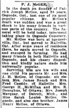In the death on Sunday of Patrick Joseph McGee, aged 38 years. Osgoode, Ont., lost one of its most popular citizens. Mr. McGee's death was sudden and was a great shock to his many friends in various parts of the country. The funeral will be held today, Interment taking place in Osgoode Cemetery.