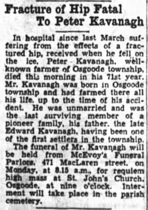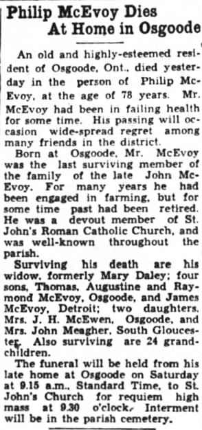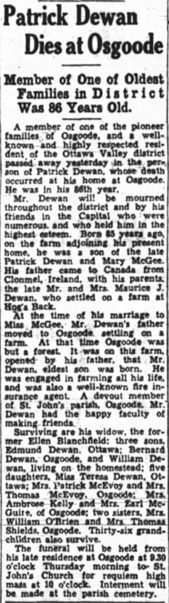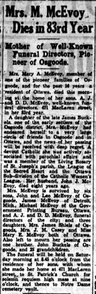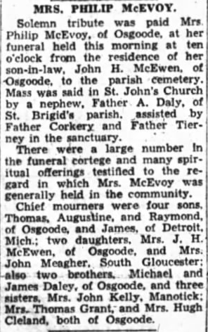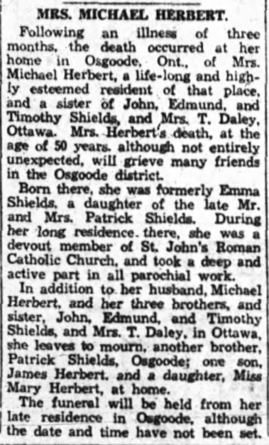 Following an illness of three months, the death occurred at her home in Osgoode, Ont., of Mrs. Michael Herbert, a life-long and highly esteemed resident of that place, and a sister of John, Edmund, and Timothy Shields, and Mrs. T. Daley, Ottawa, Mrs. Herbert’s death, at the age of 5O years, although not entirely unexpected, will grieve many friends in the Osgoode district.