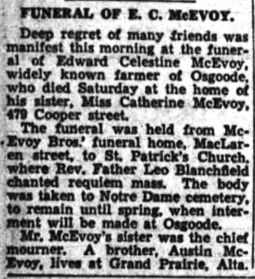 The funeral will be held from her late residence In Osgoode. although the date and time have not been set.